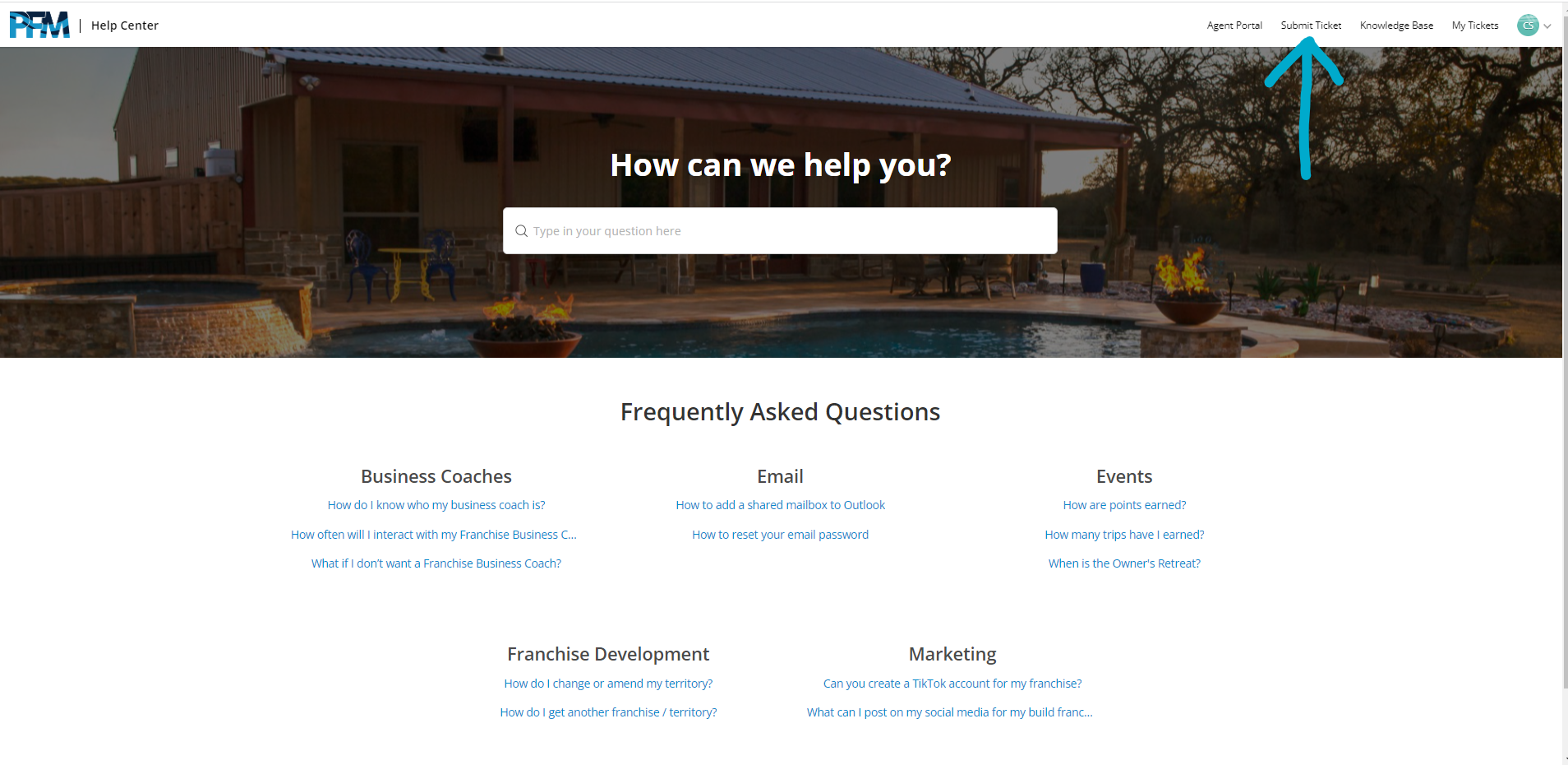 From the landing page, click on the words “Submit Ticket” at the upper right side of the page.